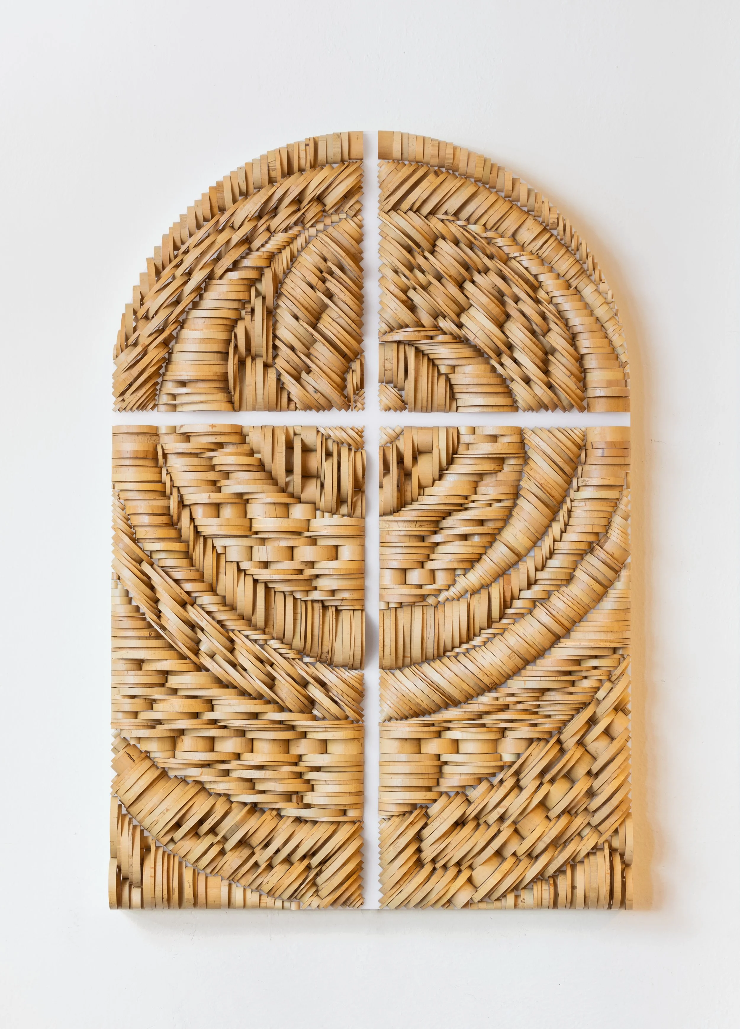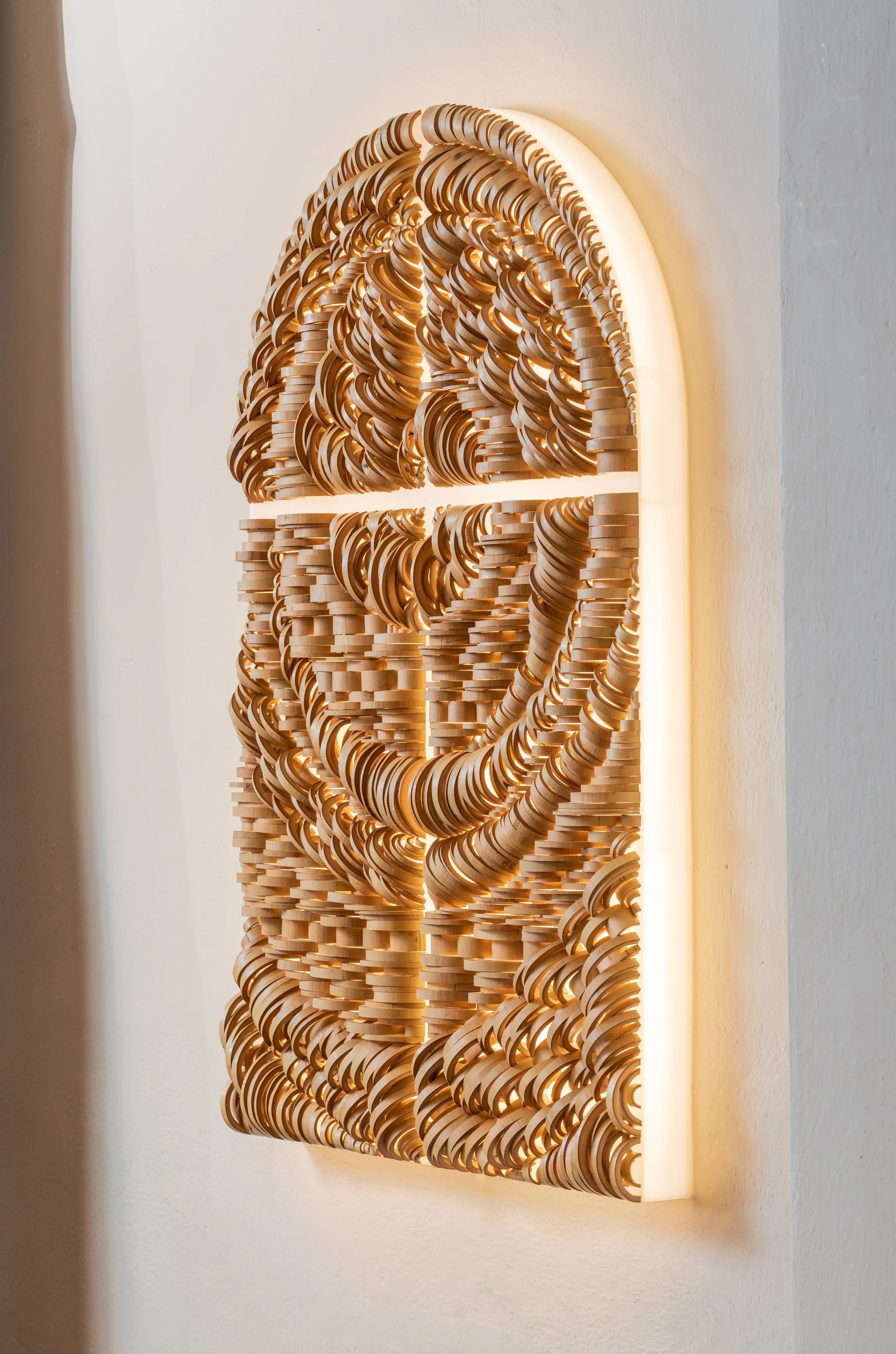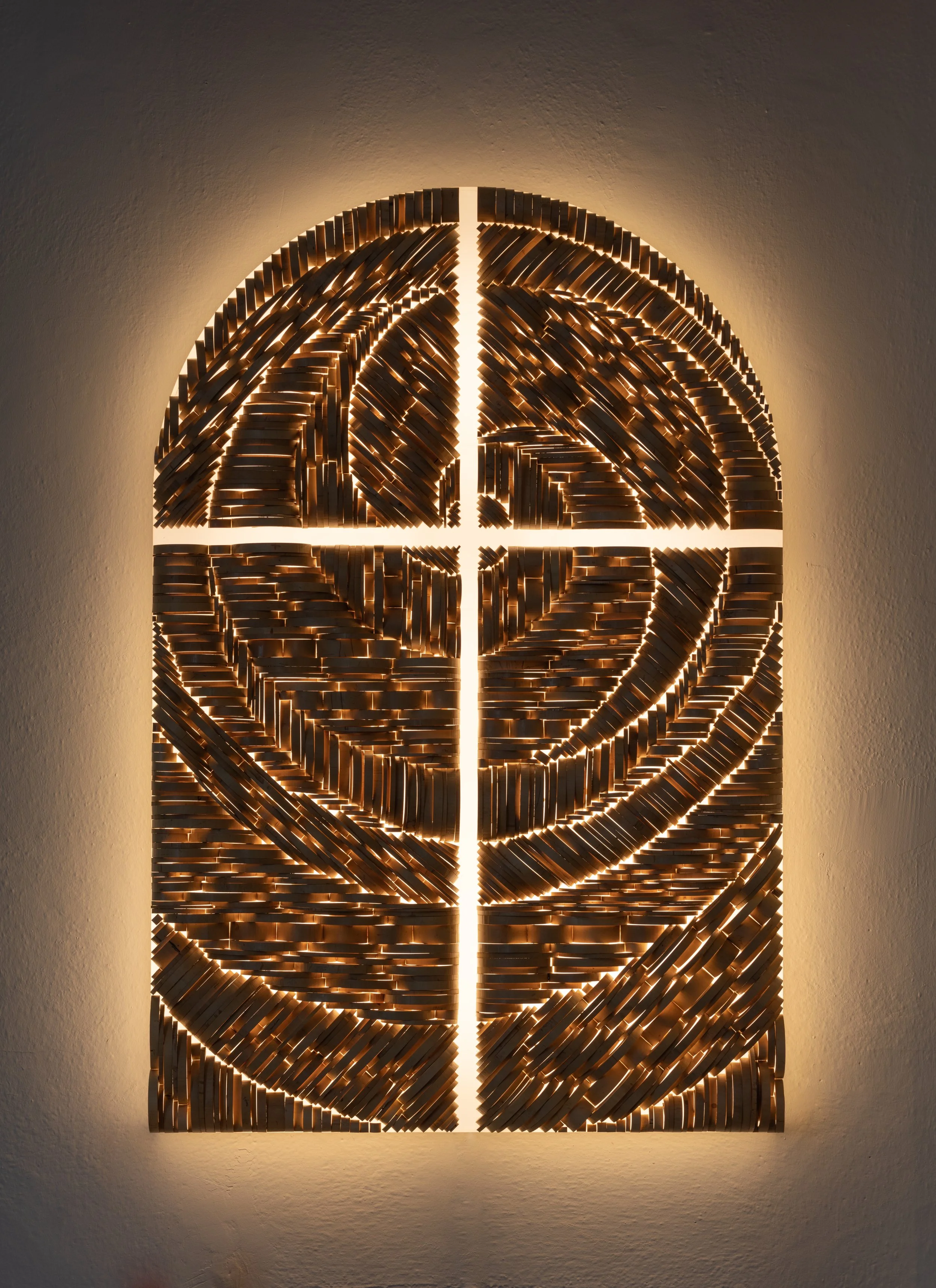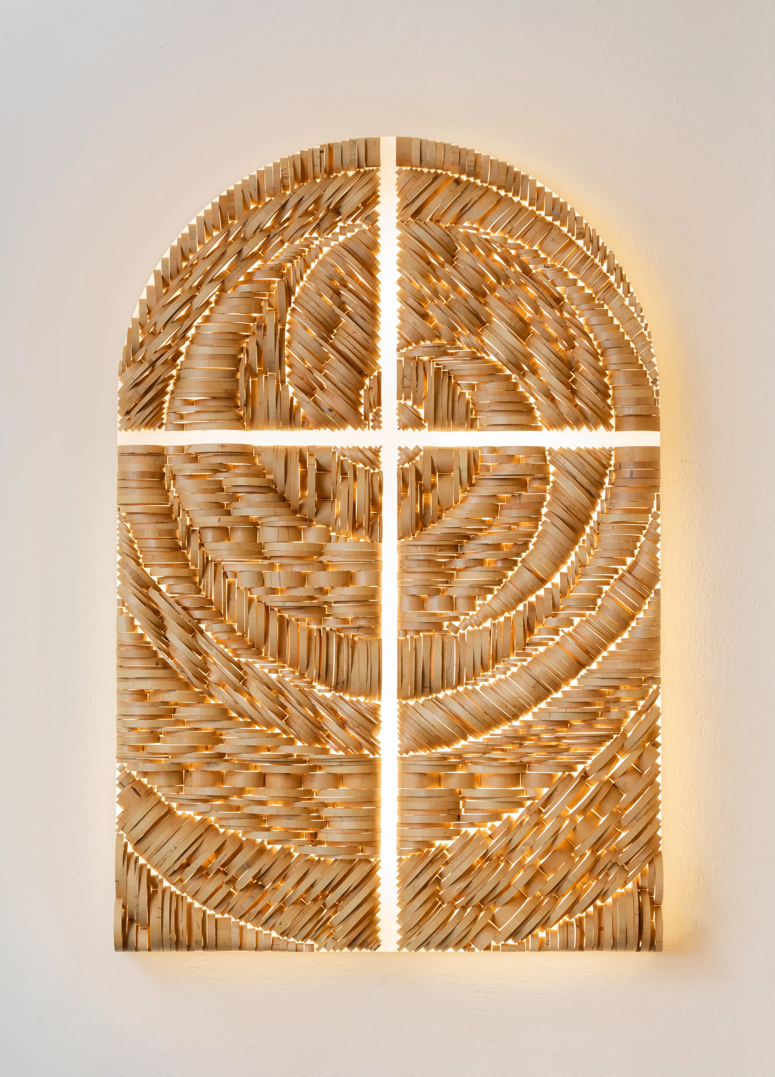 Crosscut bamboo, acrylic, wood, and LED lighting