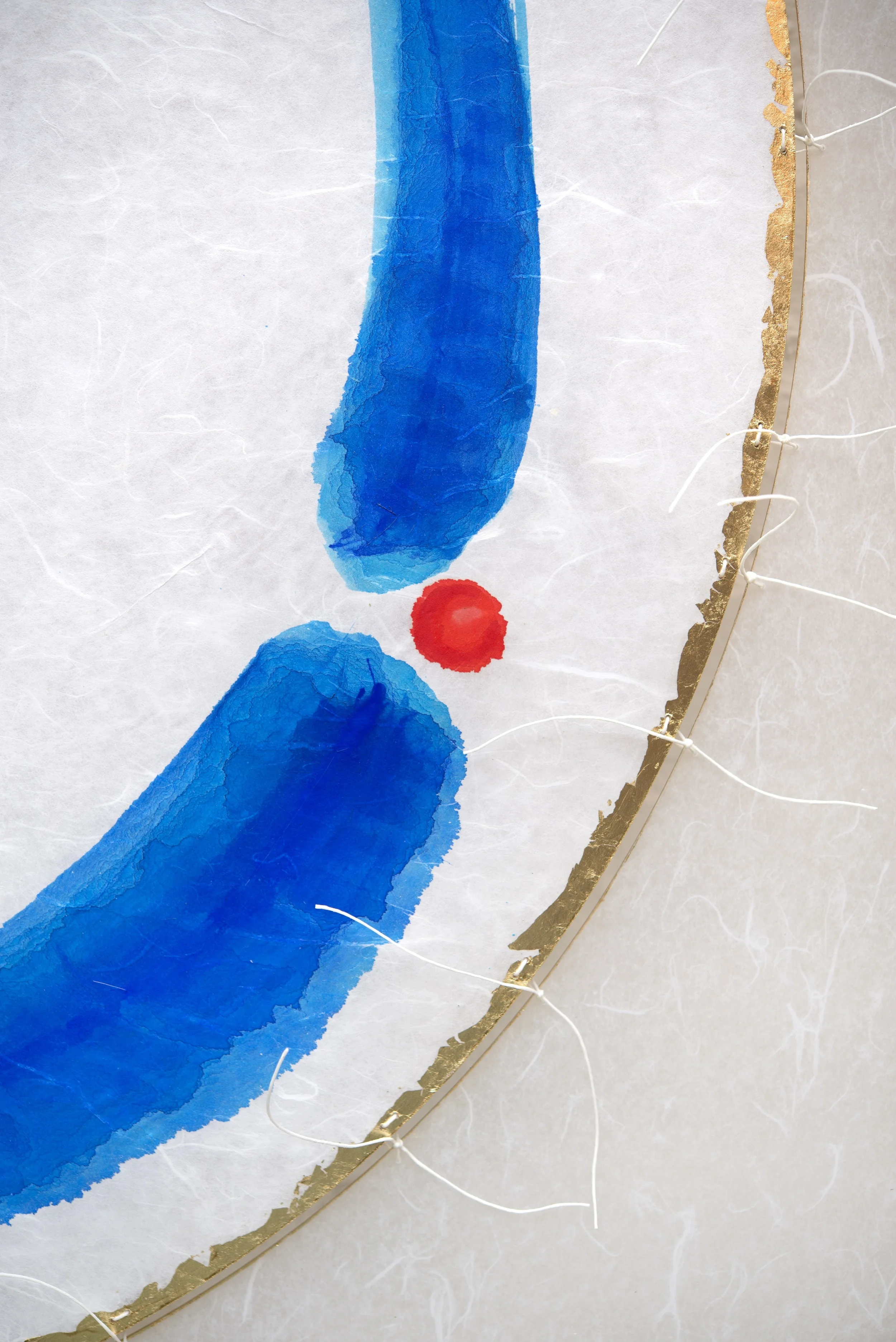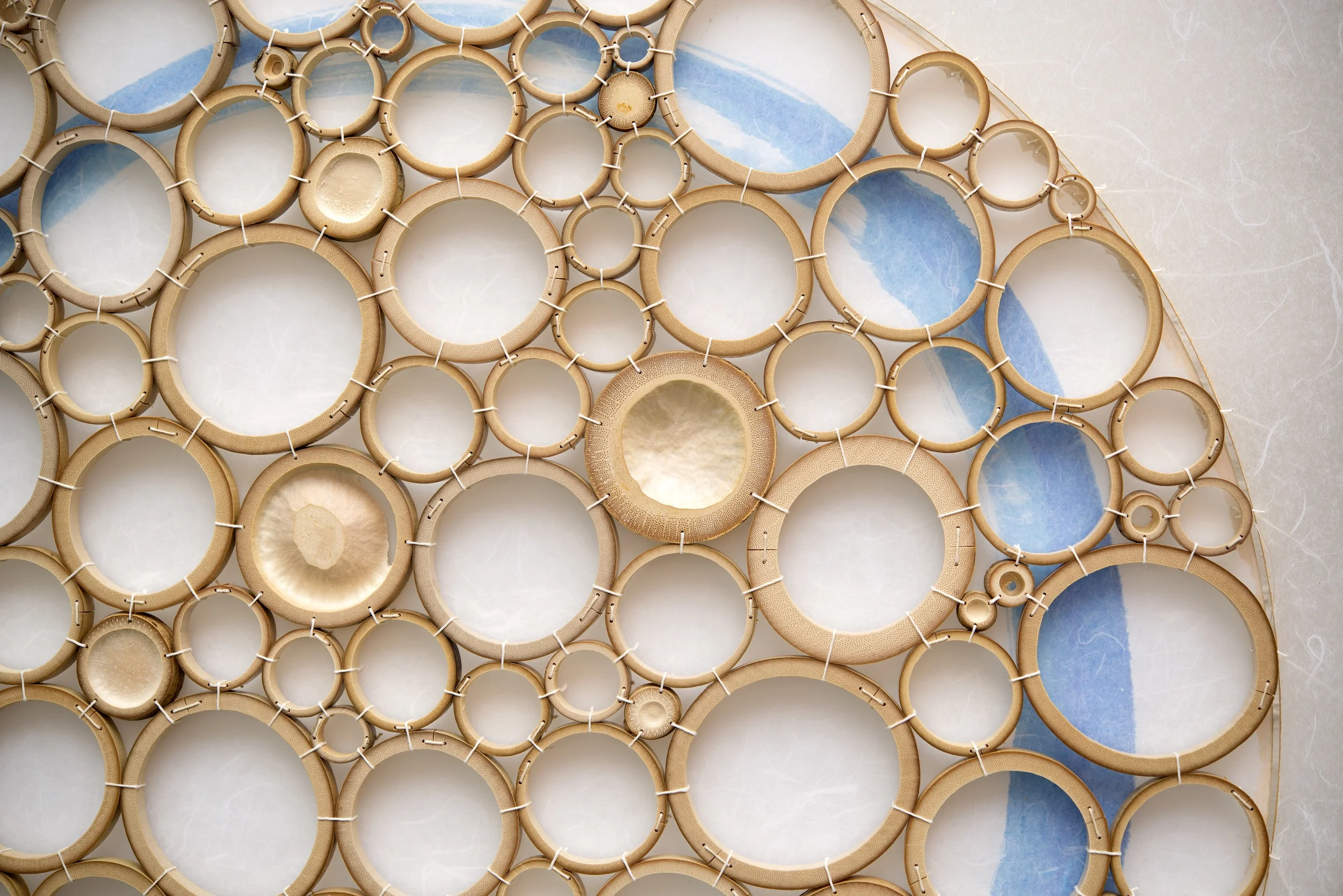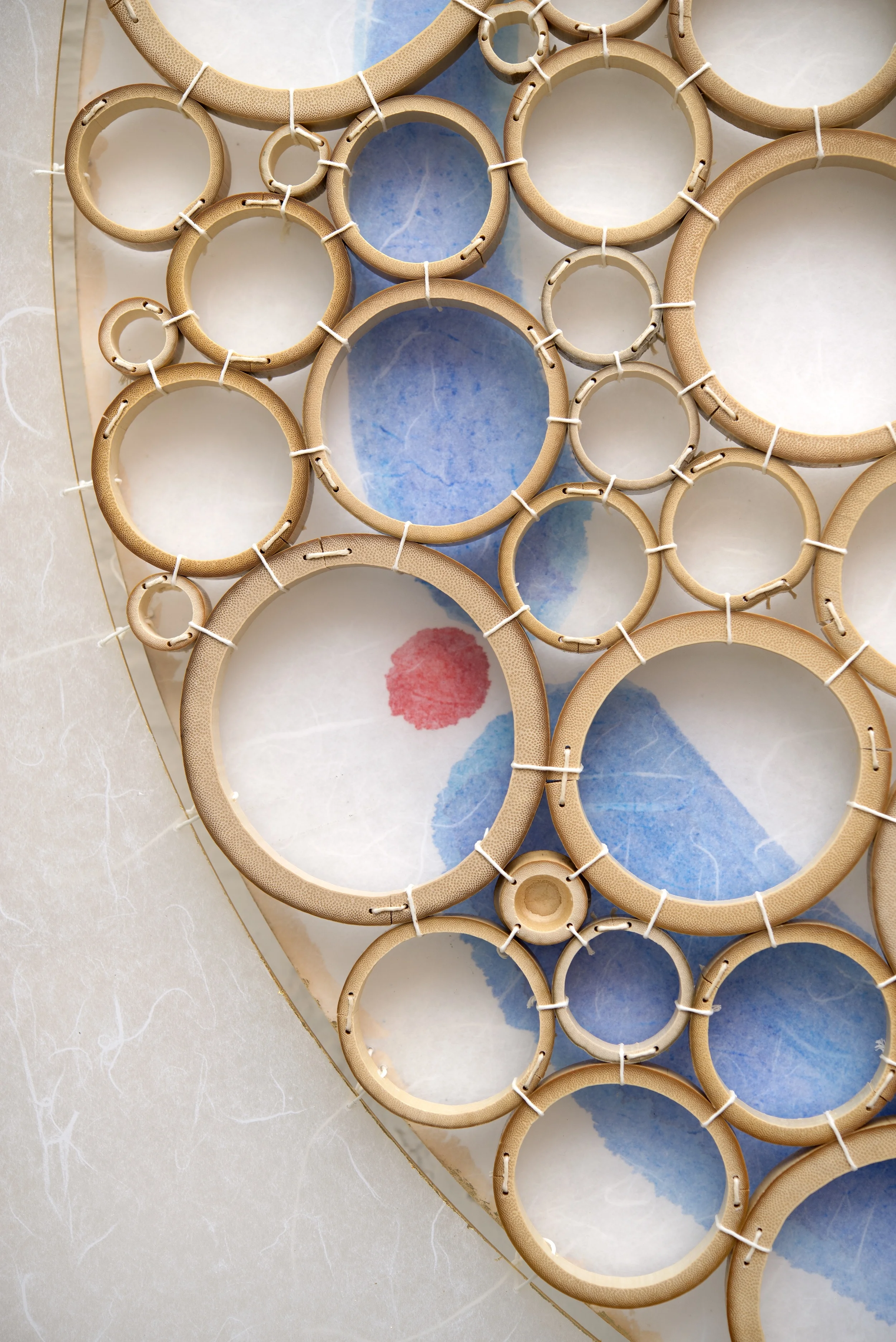 Crosscut bamboo, Irish waxed linen thread, Korean rice paper, Watercolor, Japanese acrylic, Basswood frame