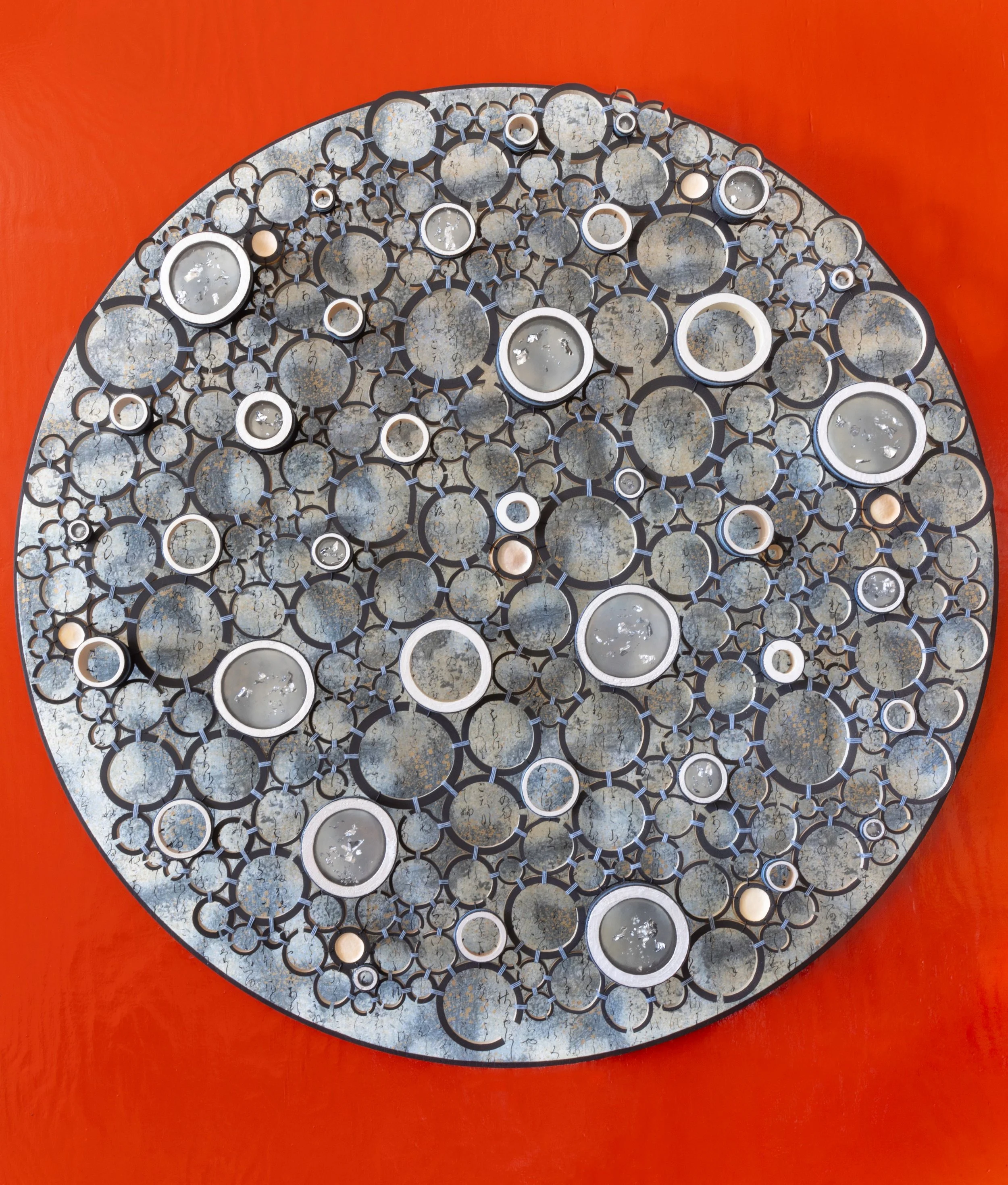 Crosscut bamboo, Acrylic paint, Irish waxed linen thread, Silver leaf, Epoxy resin, Washi paper, Wood