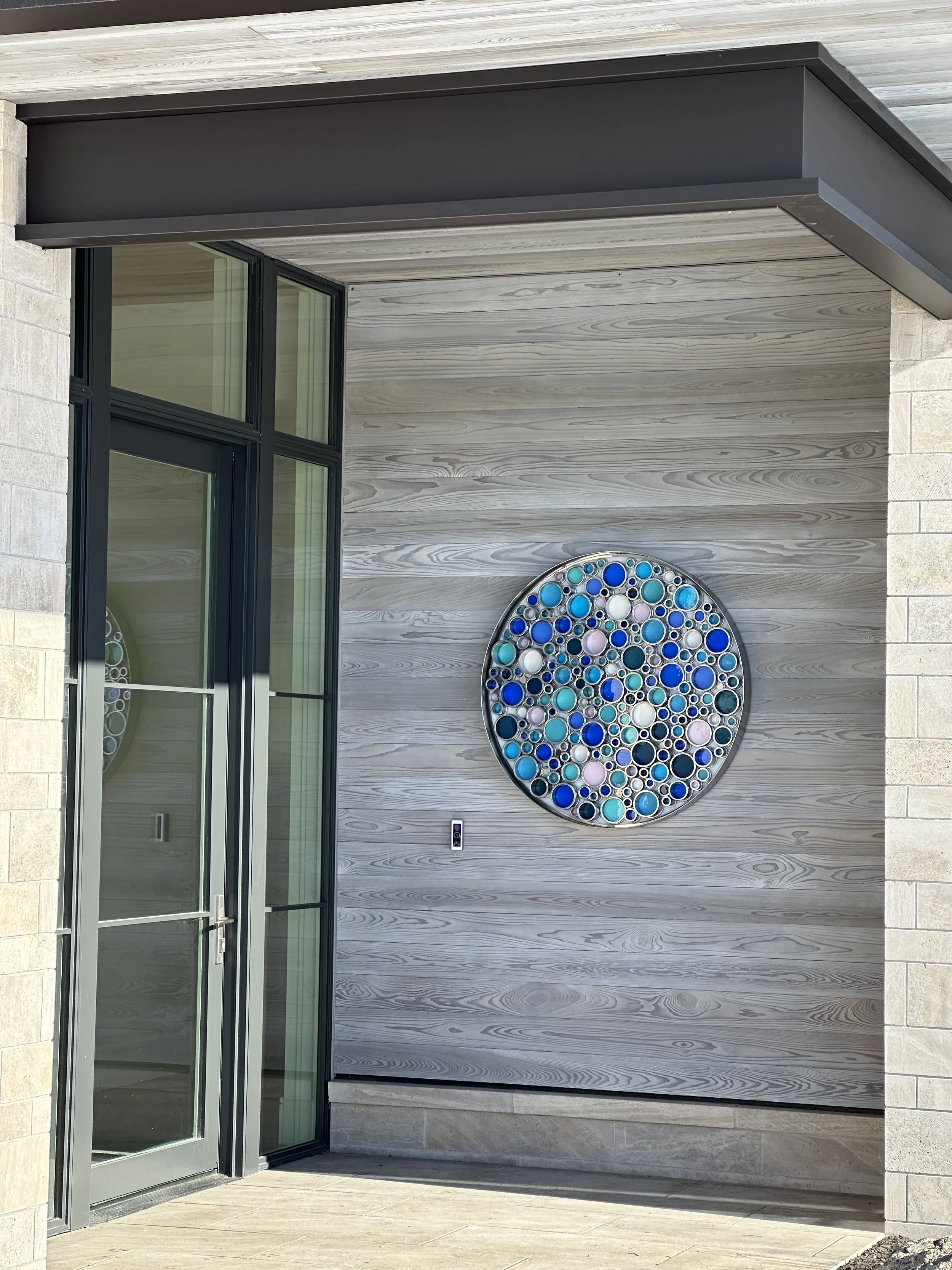 Powder-coated aluminum plates, rings, and stainless steel; fused glass, LED lighting.