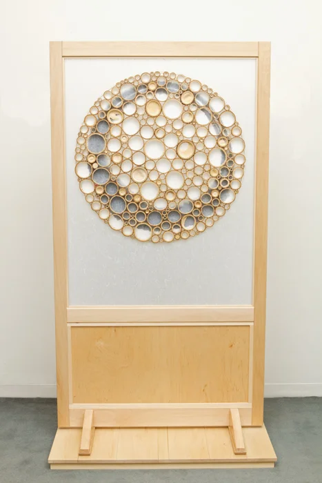 Crosscut bamboo, Irish waxed linen thread, Japanese acrylic, wood, rice paper, paint